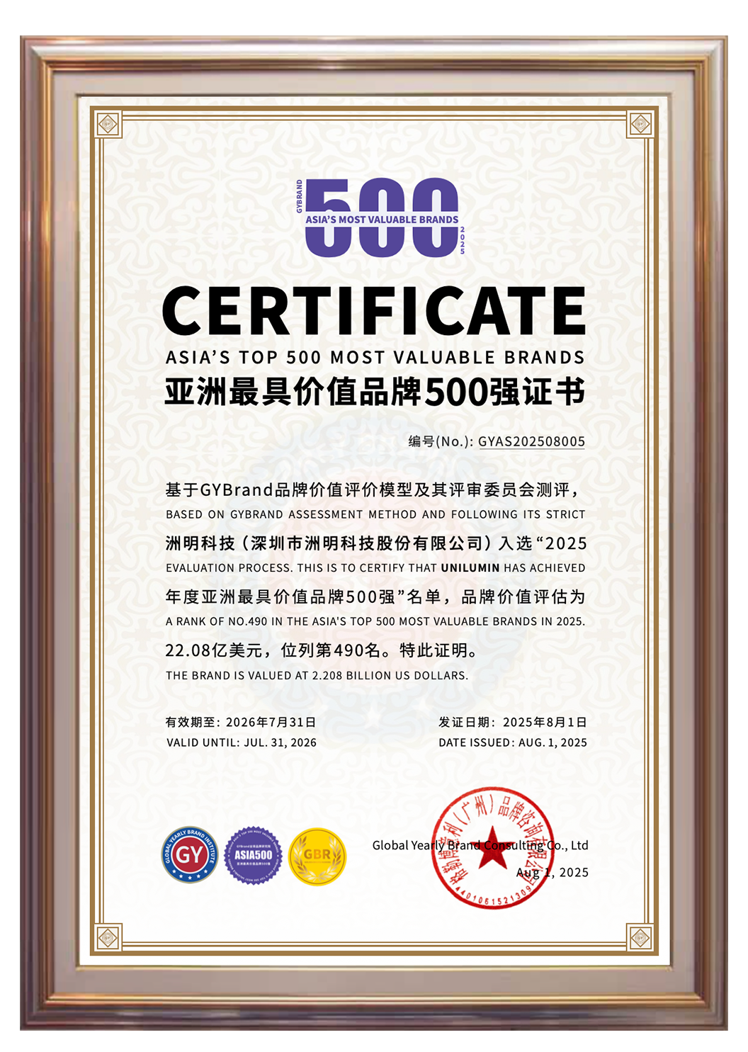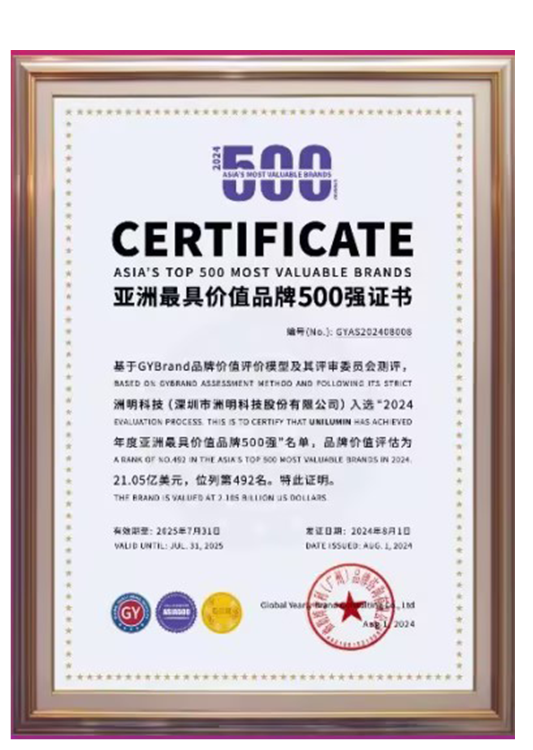 2025年获亚洲最具价值品牌500强