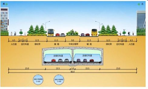 桂庙路地下东行隧道因地处城市中心,周围建筑物林立,故选择采用地面、地下双层道路布置,而地下道路结构底与地铁盾构顶最小距离仅6米。
