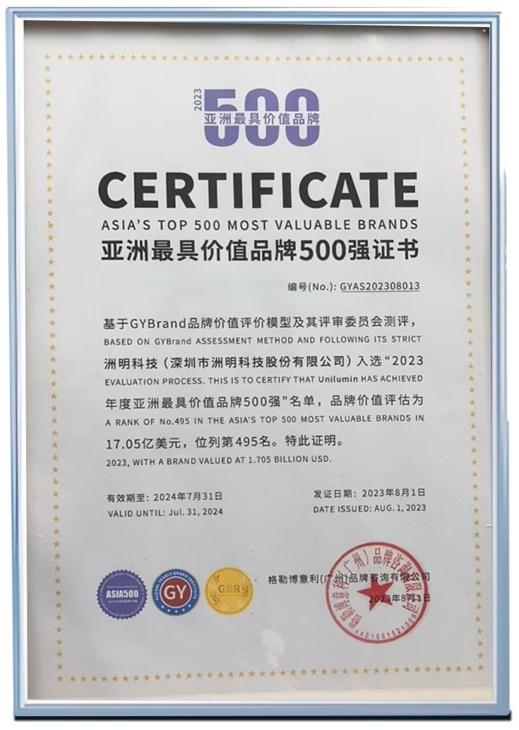 2023年获亚洲最具价值品牌500强