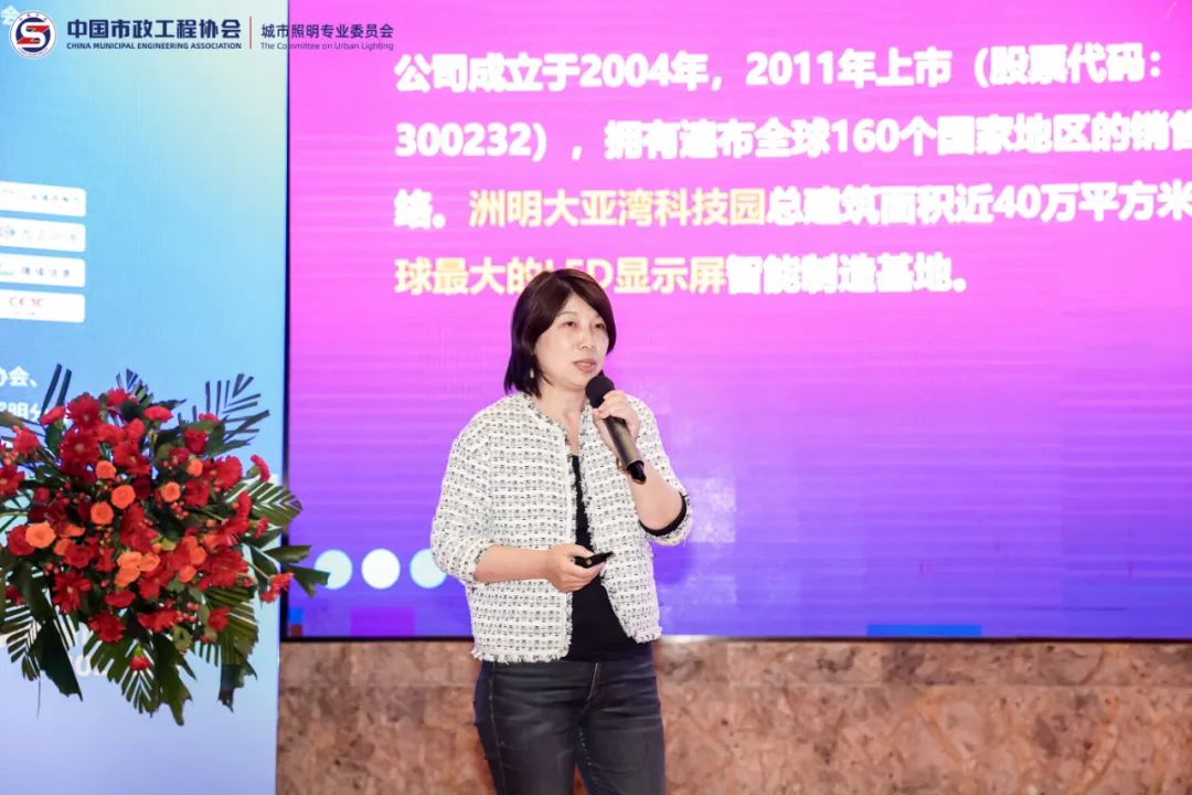 在论坛期间,洲明照明产品线总经理陆燕女士做了《洲明科技户外照明综合产品解决方案的创新》主题演讲。陆燕总经理深入剖析了当前照明行业的发展趋势,特别是如何通过创新的综合产品解决方案,助力韧性城市建设。她强调,洲明照明始终坚持技术创新,不断提升产品的智能化水平和应用场景,以满足现代城市的多样化需求。
