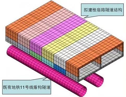 桂庙路地下东行隧道因地处城市中心,周围建筑物林立,故选择采用地面、地下双层道路布置,而地下道路结构底与地铁盾构顶最小距离仅6米。
