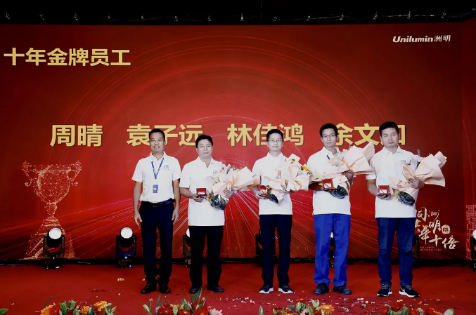 为总结过去十年的发展经验,对洲明十年金牌员工进行表彰,2021年6月22日,洲明科技上市十周年员工表彰大会在深圳福永总部召开。大会以线下小型会场、线上视频参会的形式进行,洲明科技董事长兼总裁林洺锋先生携集团高管、各部门负责人及十年金牌员工出席。